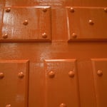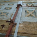 Un important travail de restitution, en conformité avec l'imposte, a consisté à recréer un ensemble de panneautages embrevés et fixés par clous forgés et croix de Saint André après étude et accord de Monsieur L'Architecte en Chef.