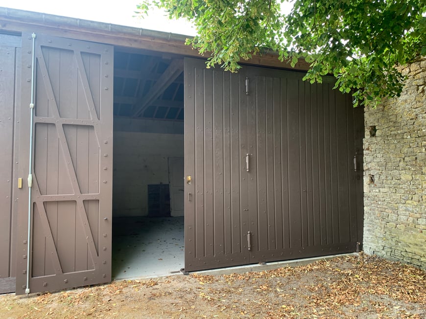 Pour un manoir du Cotentin, façon de portes de garage en chêne à quatre vantaux ouvrants, lames verticales fixées par clous forgés, quincaillerie forgée.