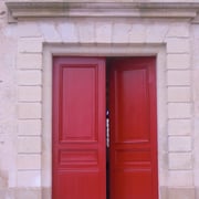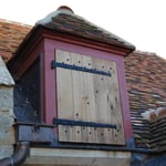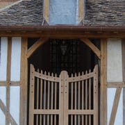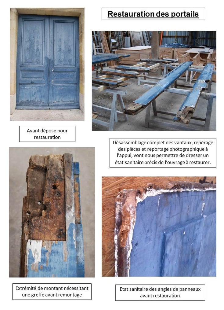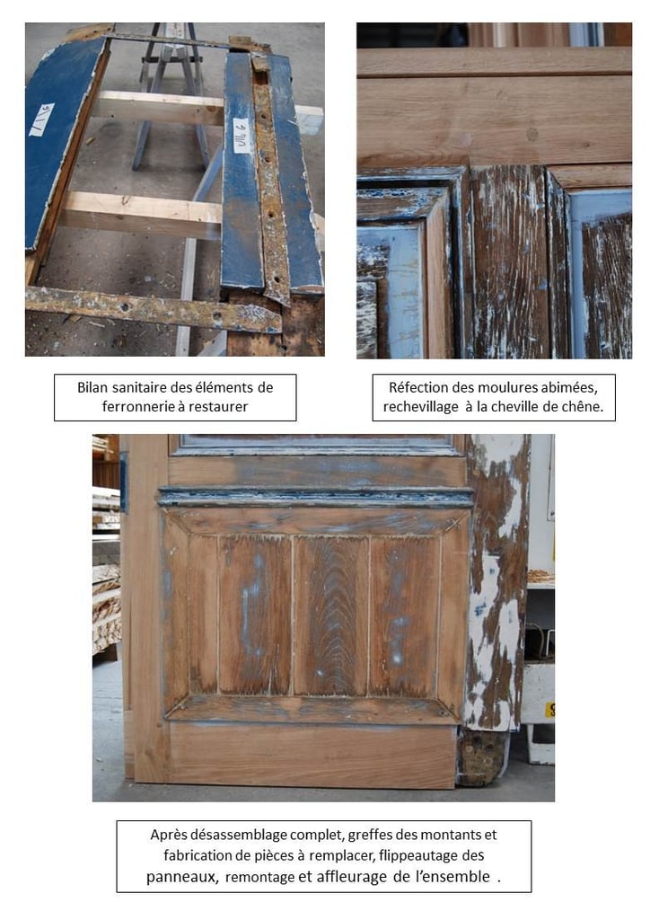 Restauration des portails Sud et Occidental, création d'une grille en bois, fabrication de porte à Grand Cadre et de portes et trappes à planches croisées et clous forgés.