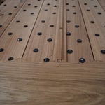 Vieillissement par défibrage, mise en teinte, application de plusieurs couches de vernis protecteur, ponçage de finition, toutes ces étapes ont été nécessaires pour magnifier le veinage des bois.