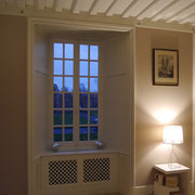 Pour le salon, nous avons fabriqué un ensemble de stylobates et chambranles moulurés, des cache-radiateurs, des lambris panneautés pour habiller les ébrasements de fenêtres.
